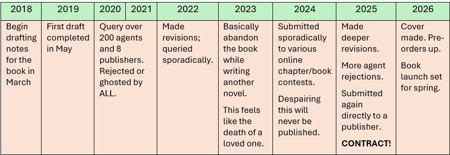 My case study is a travelogue, of sorts—one novel’s unlikely journey to publication. This simplified timeline helps to tell the story.